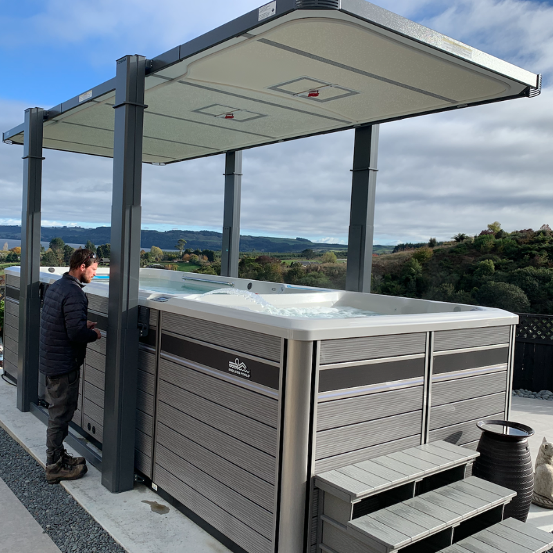 - Covana Legend Zwemspa Overkapping Elektrisch - Met de Covana Legend wordt uw zwemspa toegankelijker en gebruiksvriendelijker dan ooit tevoren. Onder bijna alle weersomstandigheden kan deze volledig geautomatiseerde cover met een eenvoudige draai aan de sleutel omhoog worden gebracht, waarna u binnen enkele seconden kunt genieten van uw zwemspa, zonder ooit te hoeven worstelen met grote onhandige covers. In gesloten toestand biedt deze robuuste afdekking, met een veel hogere isolatiewaarde dan de meeste traditionele zwemspa-afdekkingen, uiterst goede bescherming en voorkomt het ongewenste toegang voor kinderen, dieren en indringers.